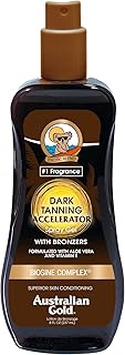 Australian Gold Australian Gold Dark Tanning Accelerator Lotion, 2020 Formula, 8 Fluid Ounce, Classic Cocoa Dreams, Classic Cocoa Dreams, 8 Fl Oz $849 ($1.06/Fl Oz) Total price: $20.95 Customers also search Page suntan accelerator indoor spray tanning lotion sunblock spray 15 spf dark tanning accelerator spray accelerator tanning tan enhancer spray With native Australian oils and vitamin E, Australian Gold Dark Tanning Accelerator Spray's exotic blend provides a superb tanning spray formula which allows your natural pigmentation process to tan as fast as nature allows. With no SPF, you get the full tanning experience and can achieve your dream tan in simply hours.