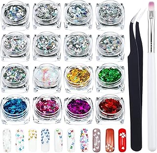 16 Boîtes de Paillettes Holographiques Papillon d’Art Ongles Paillettes Sirène Ongle Poudre Brillante Flocons Ongles Décorations d’Art Ongle Mixte avec Pince à Épiler et Stylo Pincea à Ongles UV Gel