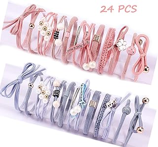 24 Pièces Élastiques Cheveux Cravates, Bowknot Perles Cheveux Bandes Cheveux Chouchous Mode Fleur Porte-Queue de Cheval Bandeaux avec Boîte pour Femmes Filles Accessoire de Coiffure - Bleu et Rose